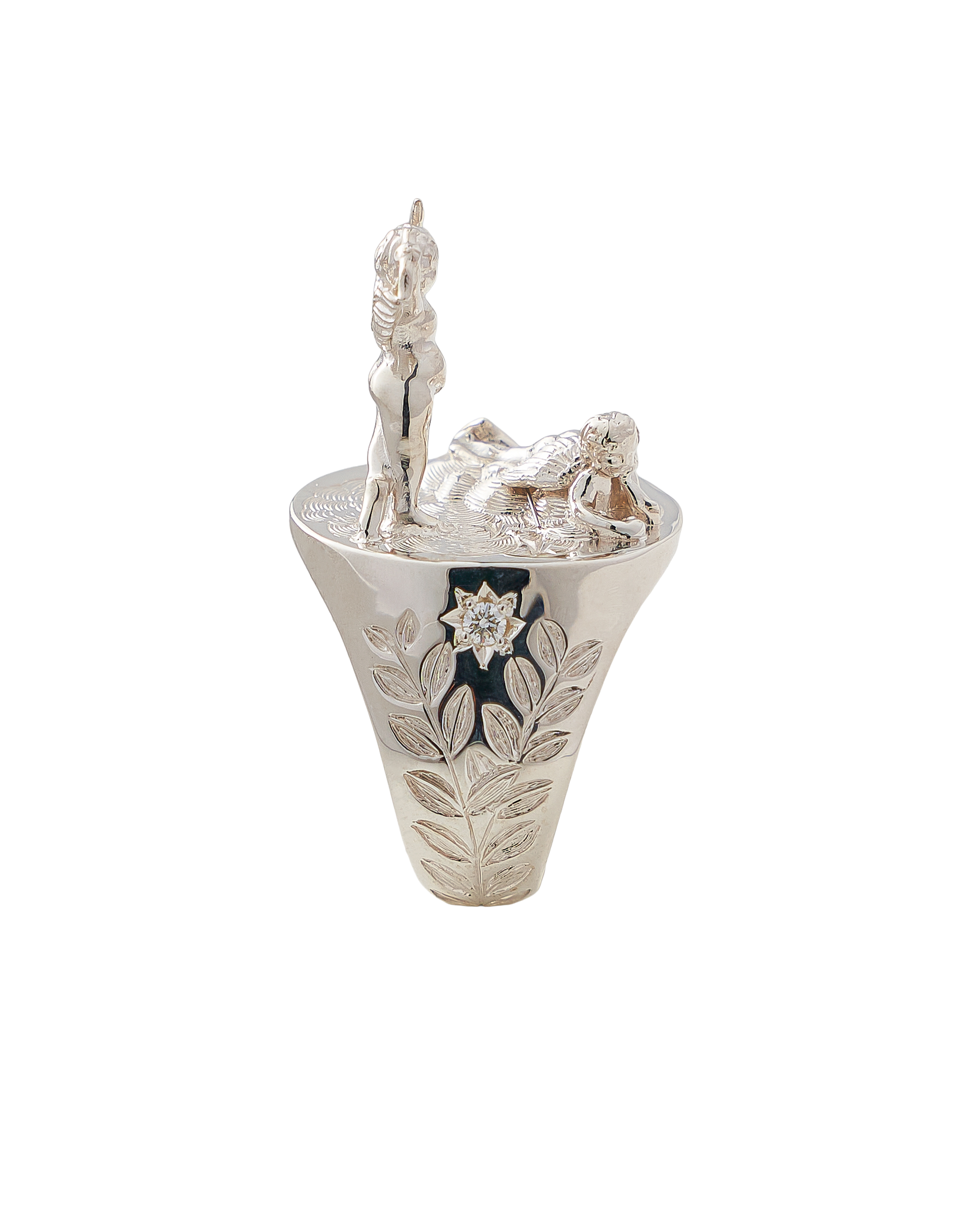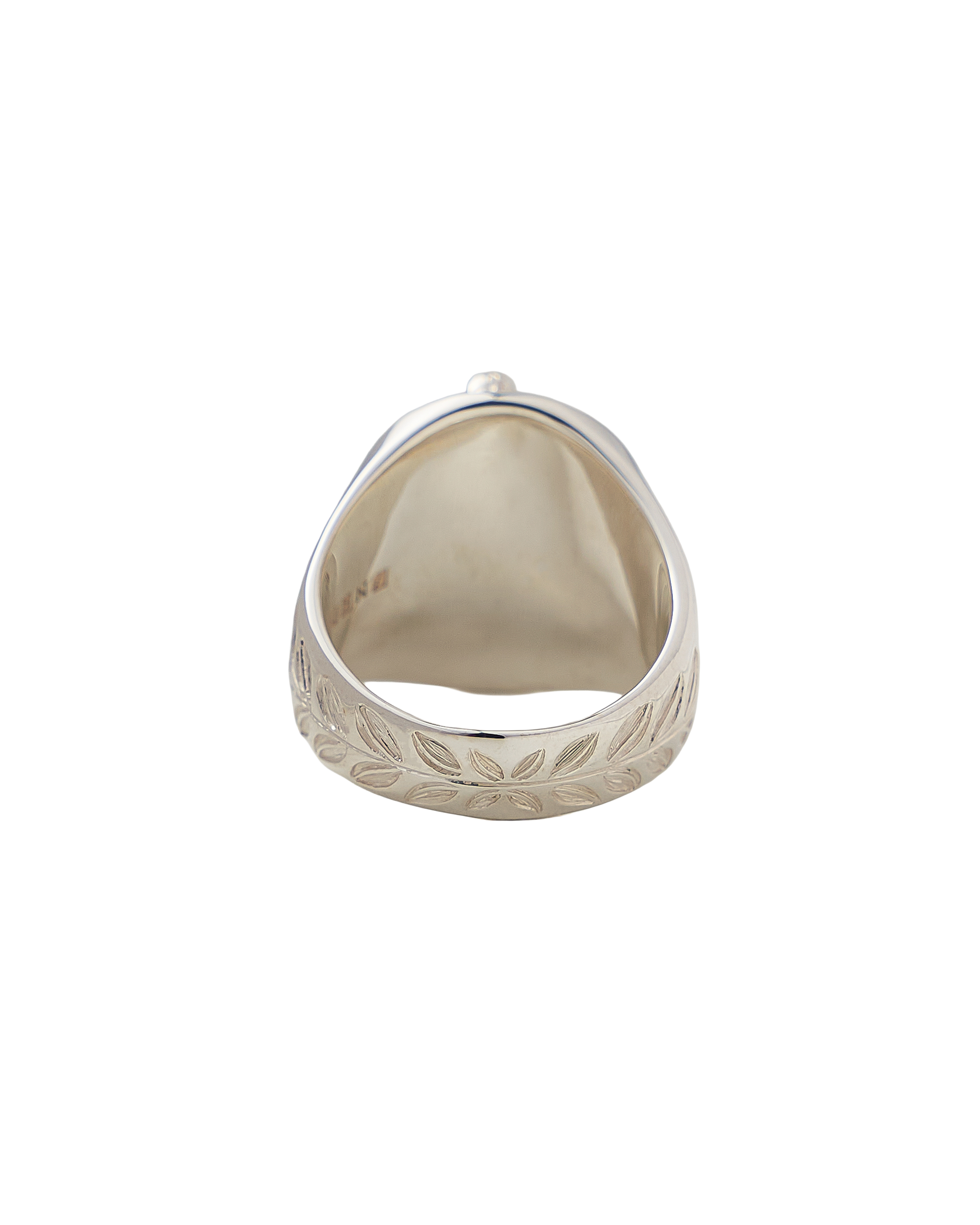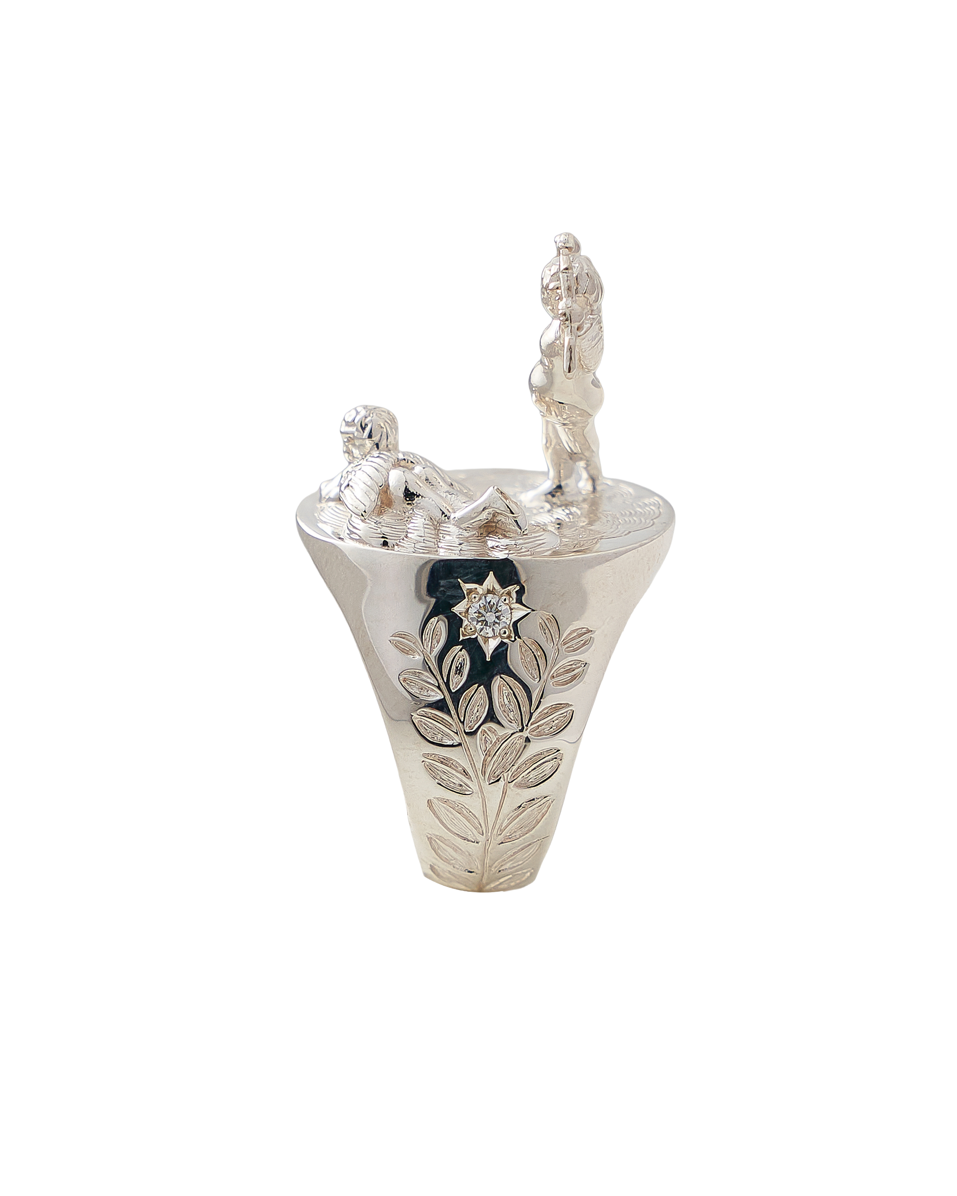 立体的なエンジェルモチーフのリング。Nicolas Poussinの絵画に描かれるような、端正で可愛らしい2人の天使が微笑みます。